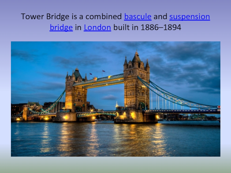 Слайд 19Tower Bridge is a combined bascule and suspension bridge in London built in 1886–1894