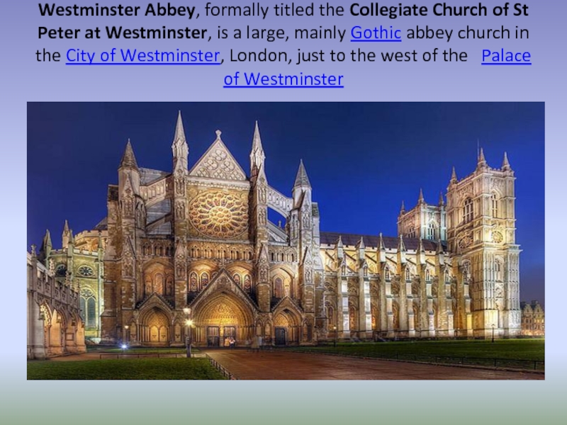 Слайд 22Westminster Abbey, formally titled the Collegiate Church of St Peter at Westminster,