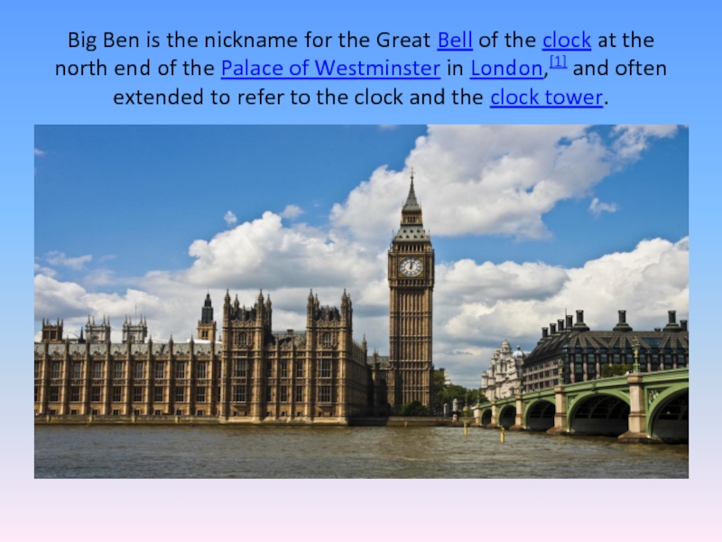 Слайд 24Big Ben is the nickname for the Great Bell of the clock at the north