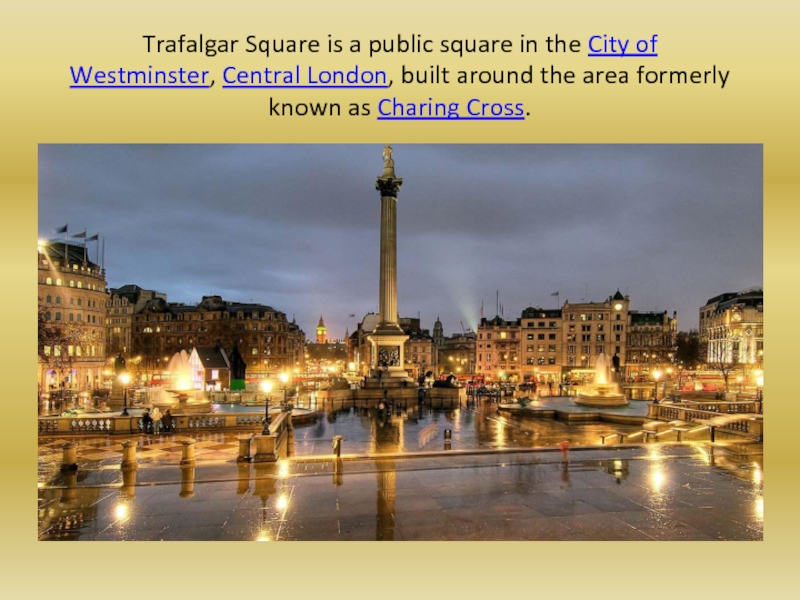 Слайд 16Trafalgar Square is a public square in the City of Westminster, Central London,