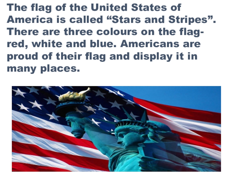 and Stripes”. There are three colours on the flag- red, white and blue. Americans are proud of their flag and display it in many places.