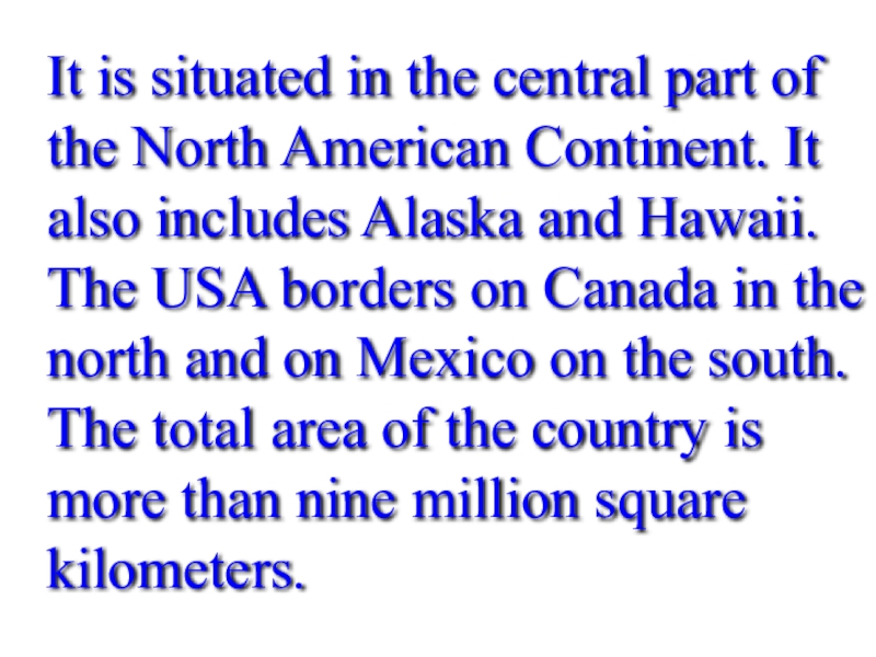Continent. It also includes Alaska and Hawaii. The USA borders on Canada in the north and on Mexico on the south. The total area of the country is more than nine million square kilometers.