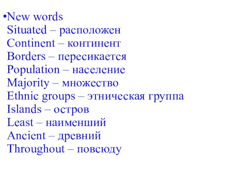 New words Situated – расположен Continent – континент Borders – пересикается Population – население Majority – множество Ethnic groups – этническая группа Islands – остров Least – наименший Ancient – древний Throughout – повсюду