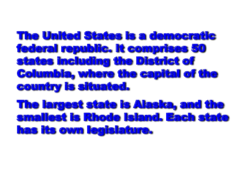 Слайд 6The United States is a democratic federal republic. It comprises 50