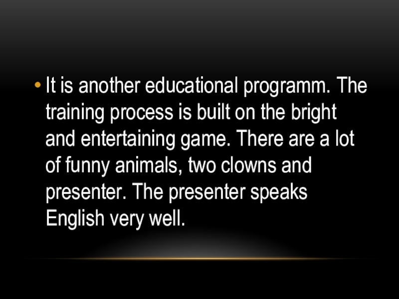 the bright and entertaining game. There are a lot of funny animals, two clowns and presenter. The presenter speaks English very well.