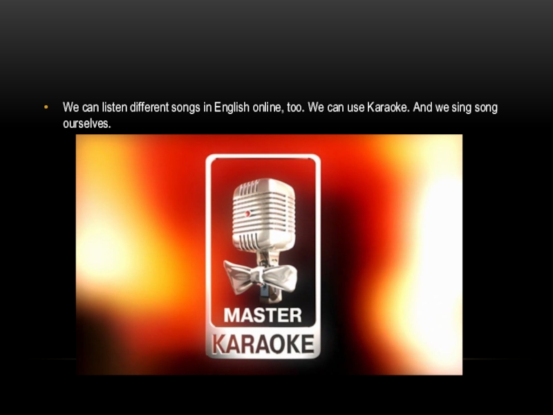 Слайд 9We can listen different songs in English online, too. We can