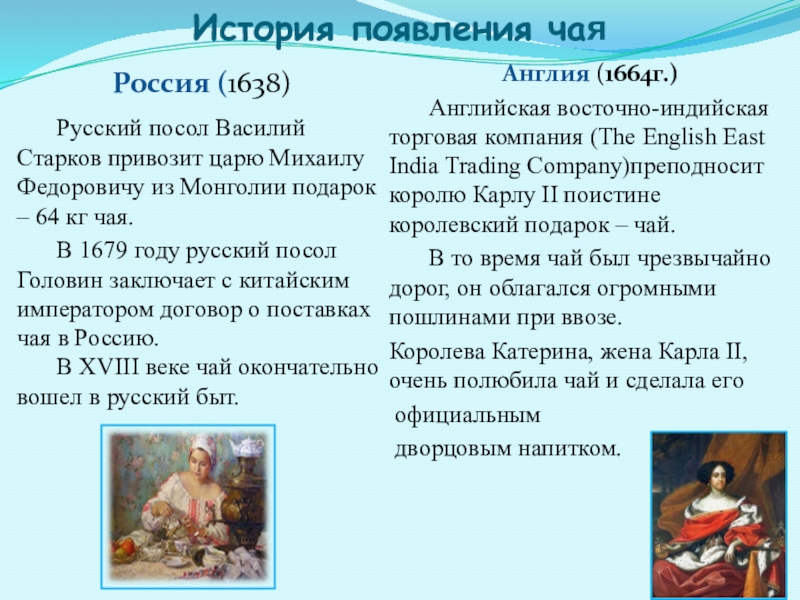 Английская восточно-индийская торговая компания (The English East India Trading Company)преподносит королю Карлу II поистине королевский подарок – чай.
