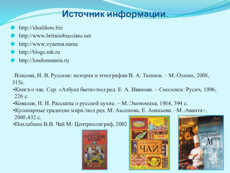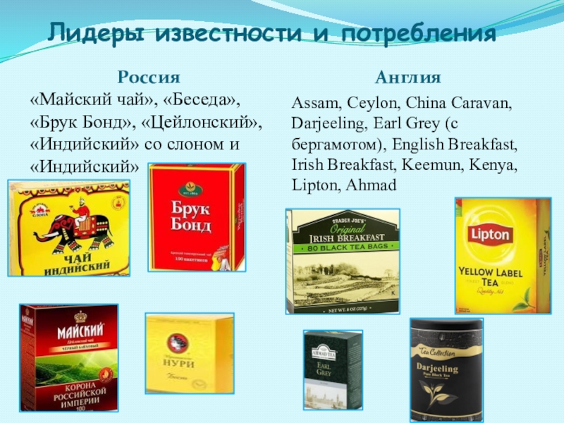 Assam, Ceylon, China Caravan, Darjeeling, Earl Grey (с бергамотом), English Breakfast, Irish Breakfast, Keemun, Kenya, Lipton, Ahmad
