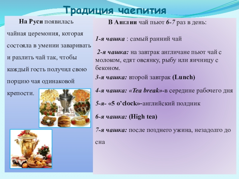 2-я чашка: на завтрак англичане пьют чай с молоком, едят овсянку, рыбу или яичницу с беконом.