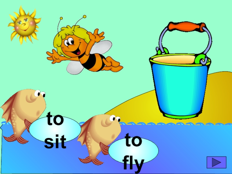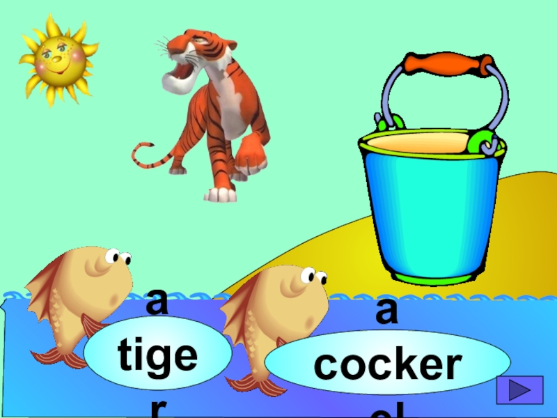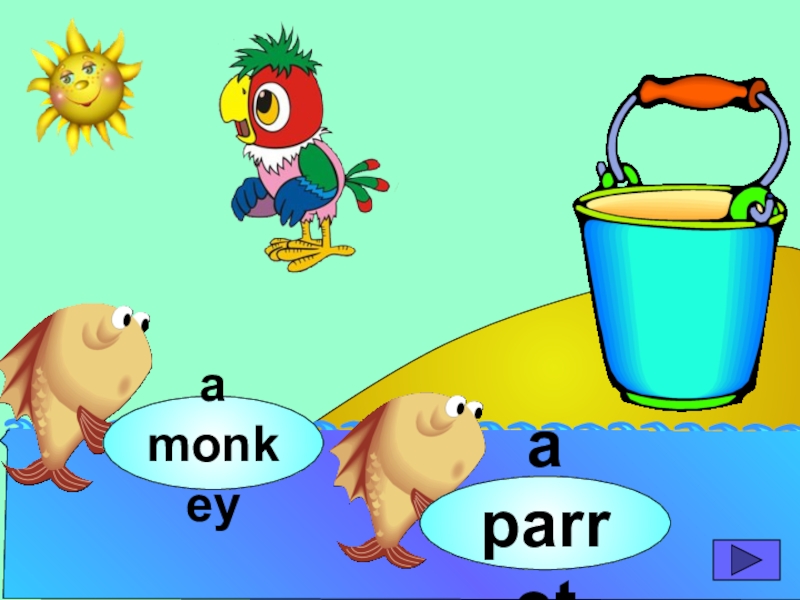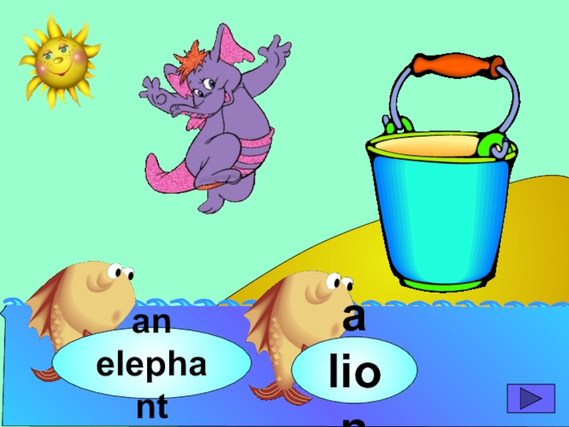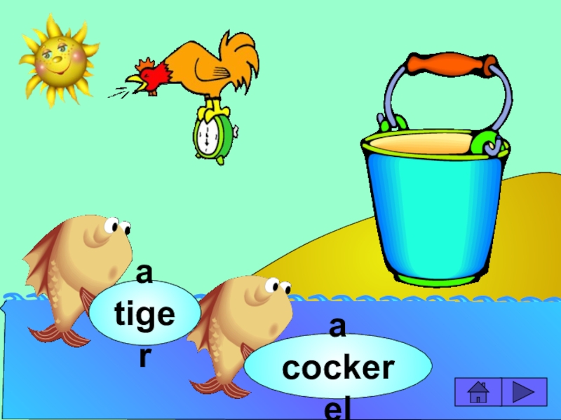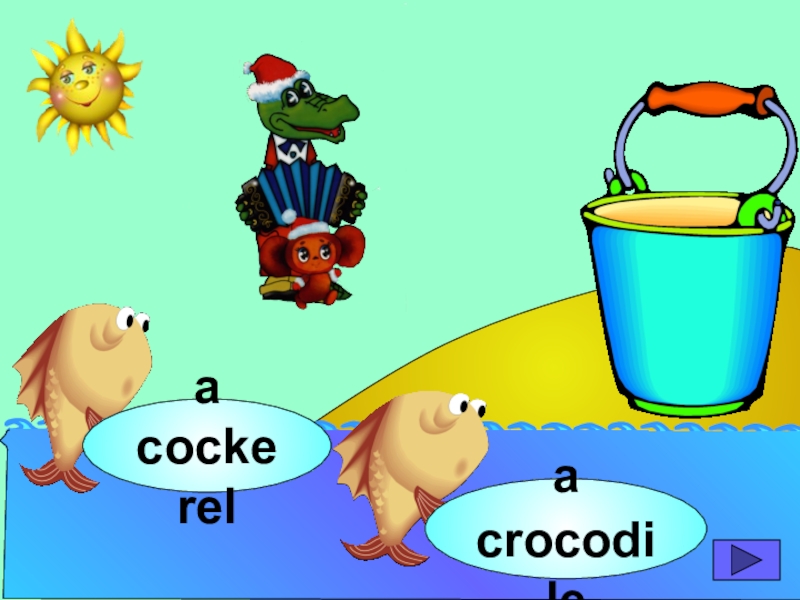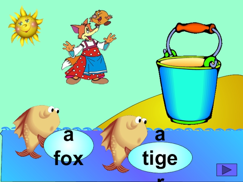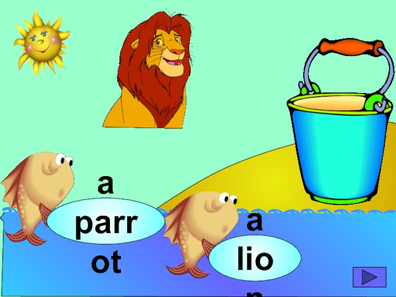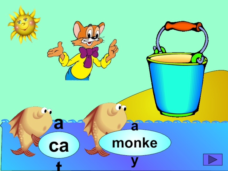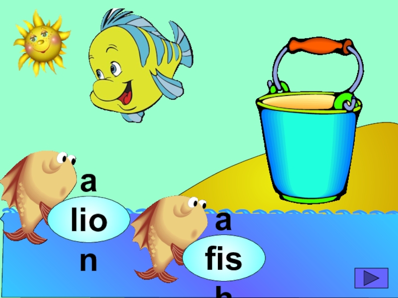 начинающих изучать английский язык. Она станет хорошим помощником для закрепления новой лексики по темам «Животные» и «Глаголы движения». В игре ребенок должен выбрать рыбку с названием нужного животного или действия. Щелчок мыши на рыбке даёт результат: если ответ верный – рыбка окажется в ведре, если же неверный – рыбка опускается вниз, в воду.