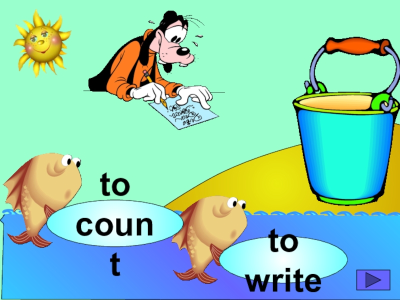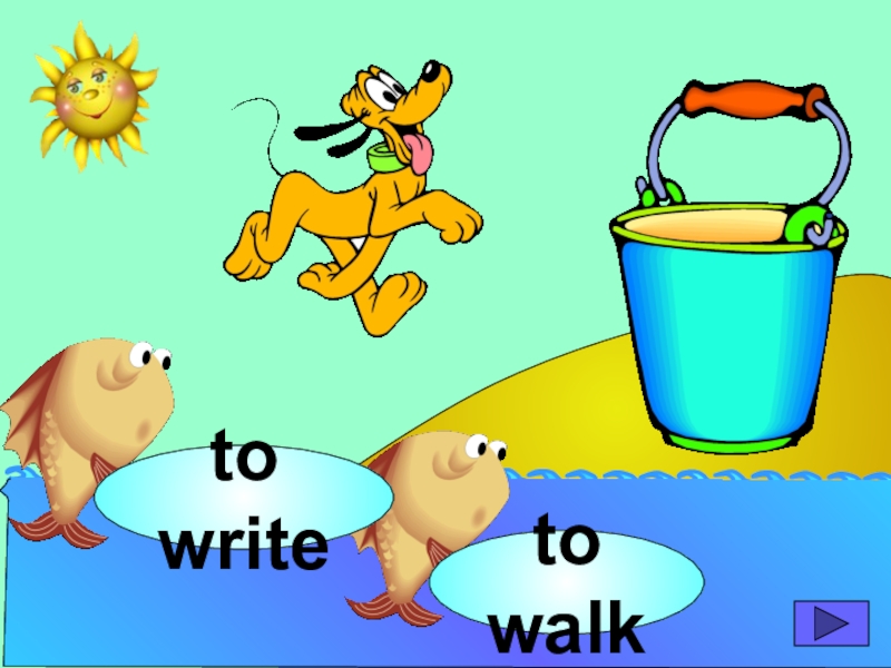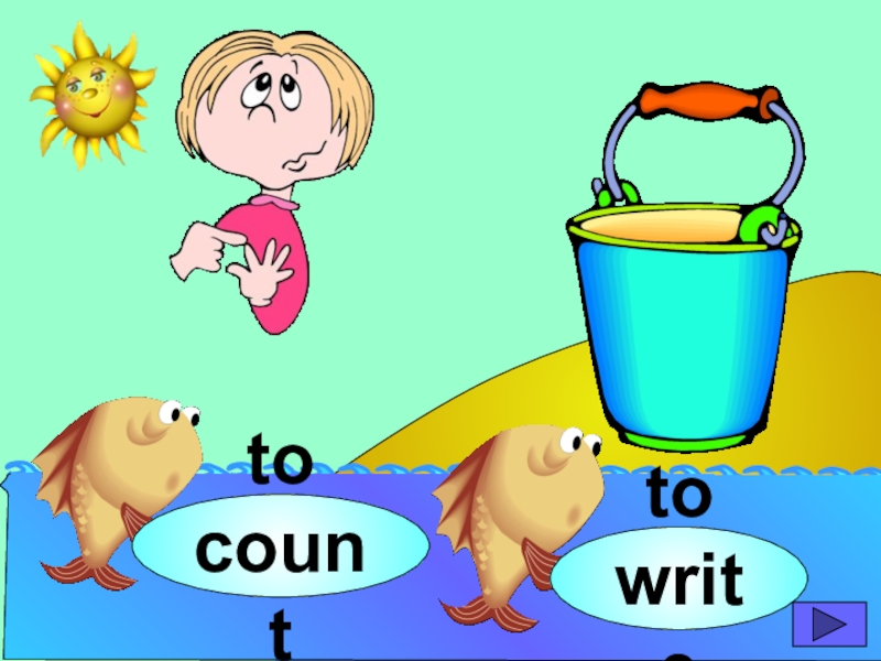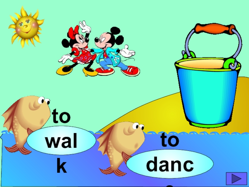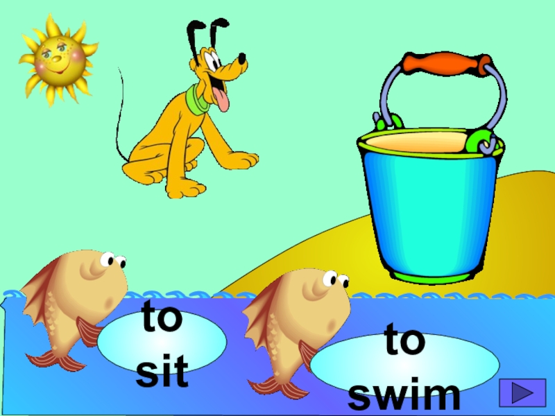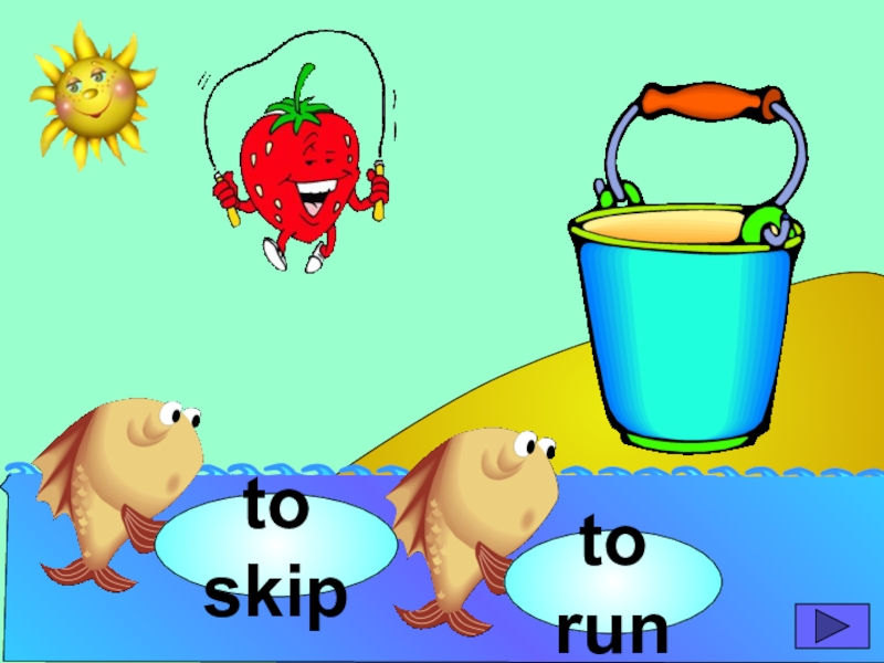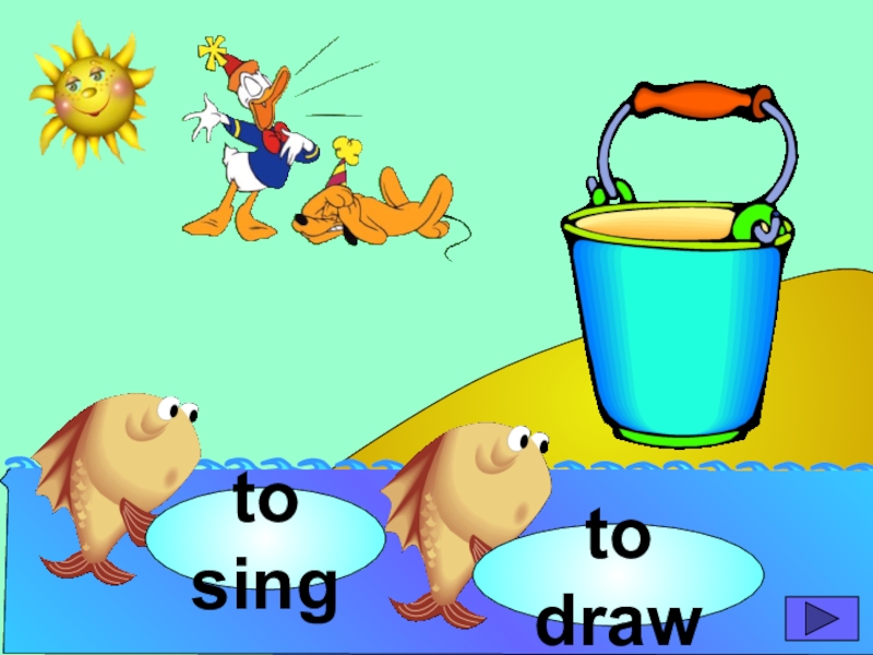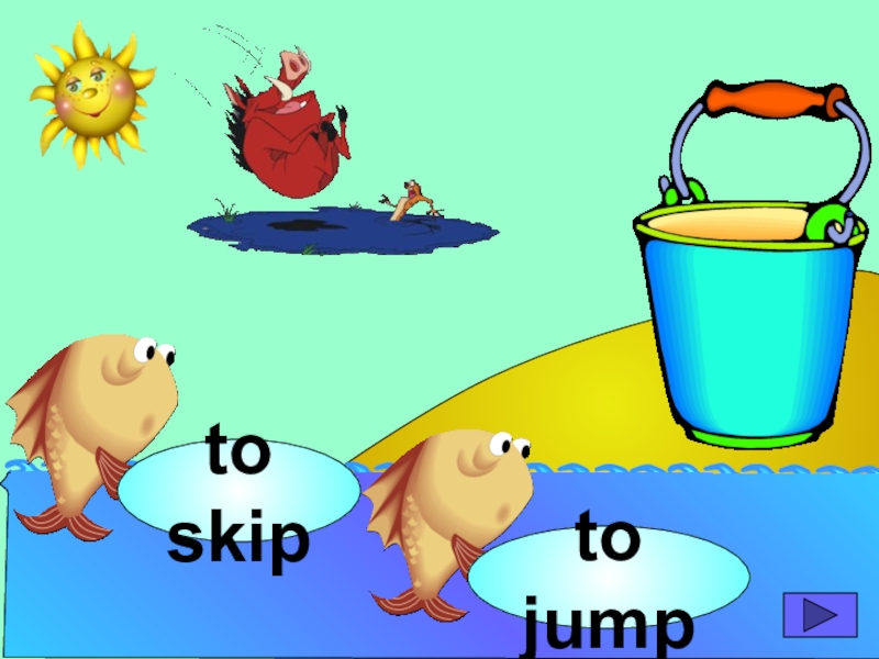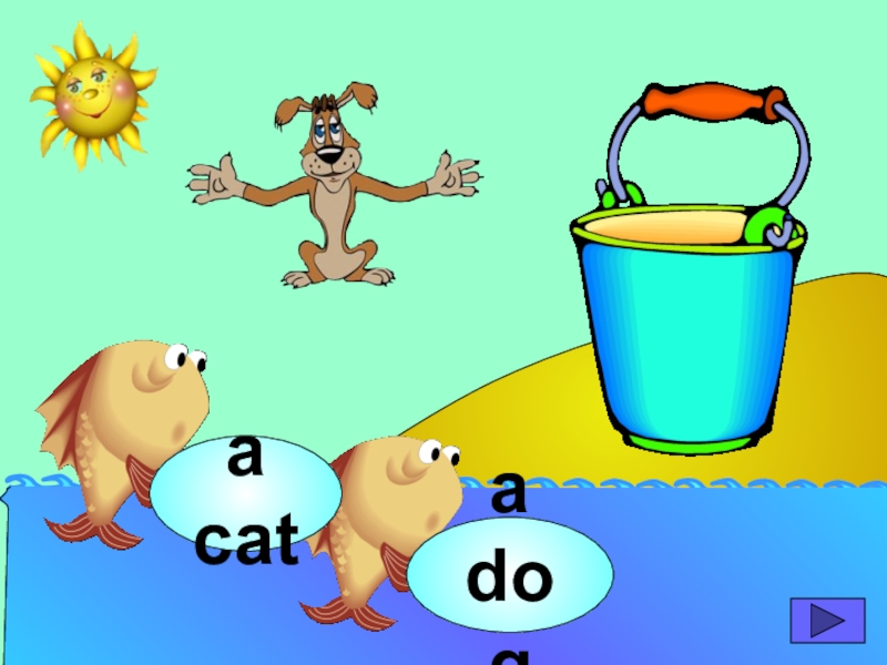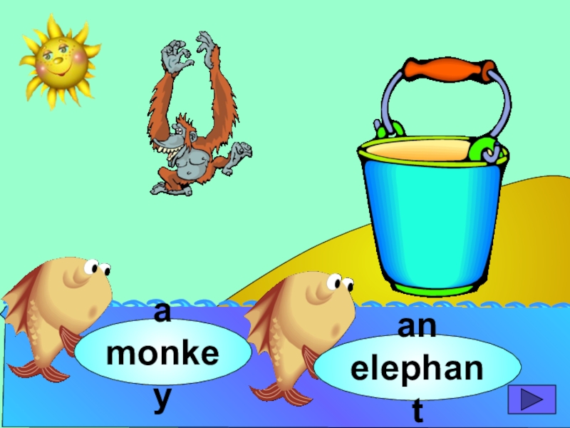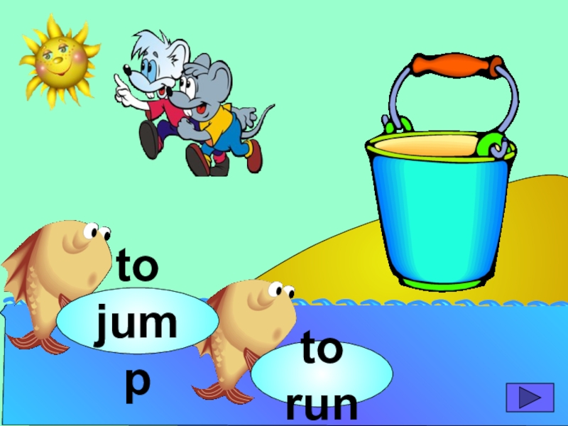 начинающих изучать английский язык. Она станет хорошим помощником для закрепления новой лексики по темам «Животные» и «Глаголы движения». В игре ребенок должен выбрать рыбку с названием нужного животного или действия. Щелчок мыши на рыбке даёт результат: если ответ верный – рыбка окажется в ведре, если же неверный – рыбка опускается вниз, в воду.