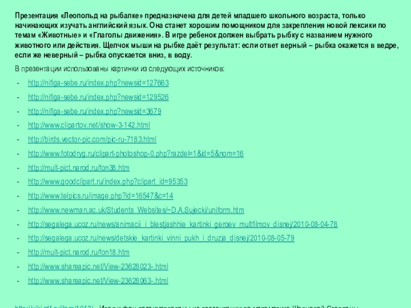Презентация «Леопольд на рыбалке» предназначена для детей младшего школьного возраста, только начинающих изучать английский язык. Она станет
