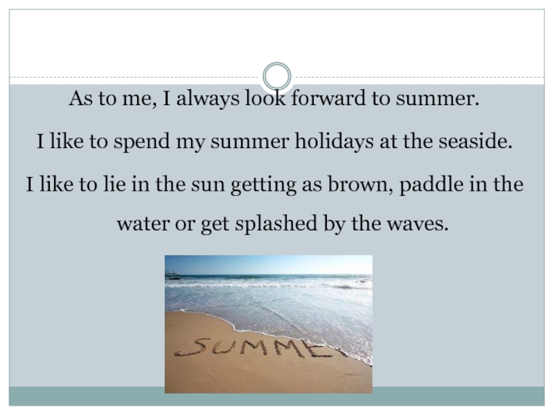 As to me, I always look forward to summer.I like to spend my summer holidays at the