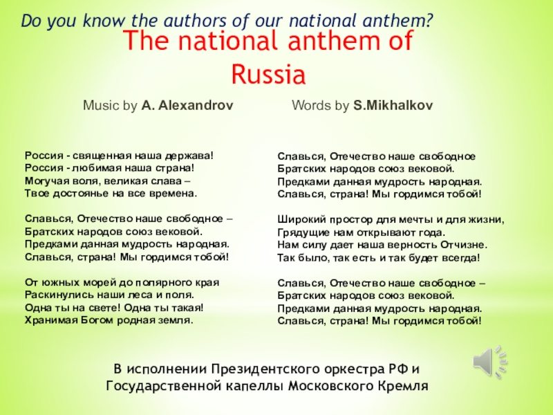 В исполнении Президентского оркестра РФ и Государственной капеллы Московского Кремля