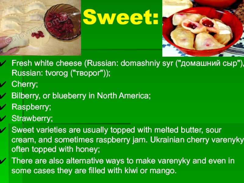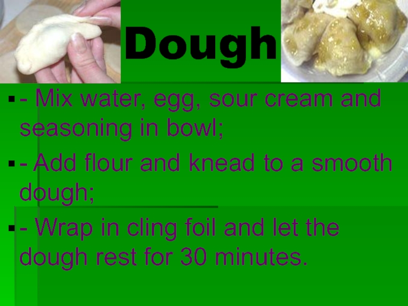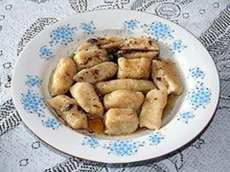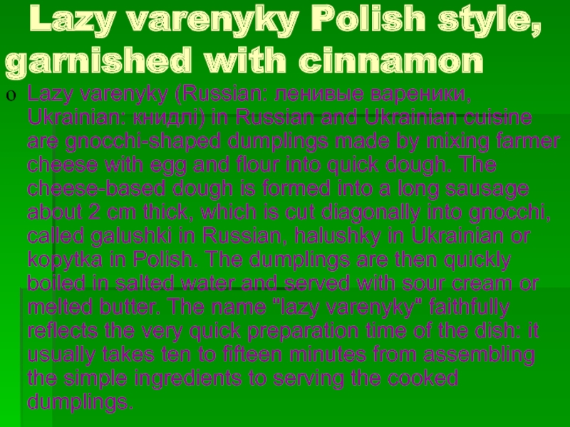 Lazy varenyky (Russian: ленивые вареники, Ukrainian: книдлі) in Russian and Ukrainian cuisine are gnocchi-shaped dumplings made by mixing farmer cheese with egg and flour into quick dough. The cheese-based dough is formed into a long sausage about 2 cm thick, which is cut diagonally into gnocchi, called galushki in Russian, halushky in Ukrainian or kopytka in Polish. The dumplings are then quickly boiled in salted water and served with sour cream or melted butter. The name "lazy varenyky" faithfully reflects the very quick preparation time of the dish: it usually takes ten to fifteen minutes from assembling the simple ingredients to serving the cooked dumplings.
