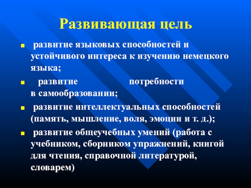 Развивающая цель развитие языковых способностей и устойчивого интереса к изучению немецкого языка;  развитие