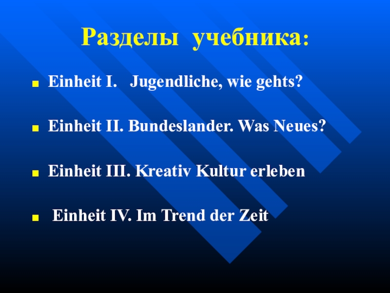 Разделы учебника:Einheit I.  Jugendliche, wie gehts?Einheit II. Bundeslander. Was Neues?Einheit III. Kreativ Kultur erleben Einheit IV.