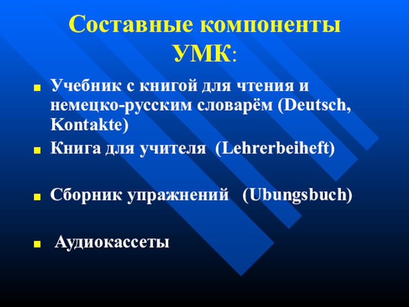 Составные компоненты УМК:Учебник с книгой для чтения и немецко-русским словарём (Deutsch, Kontakte)Книга для учителя (Lehrerbeiheft)Сборник упражнений (Ubungsbuch) Аудиокассеты
