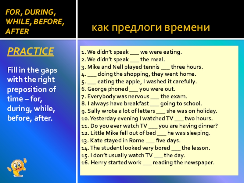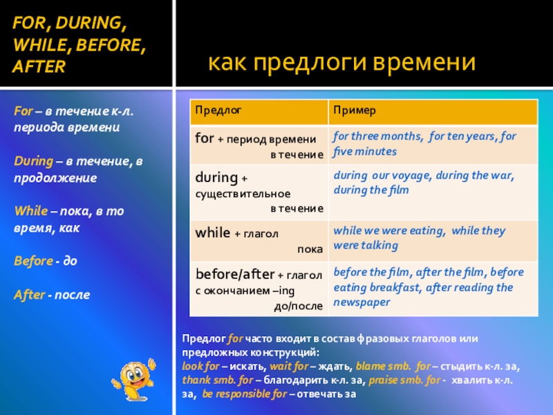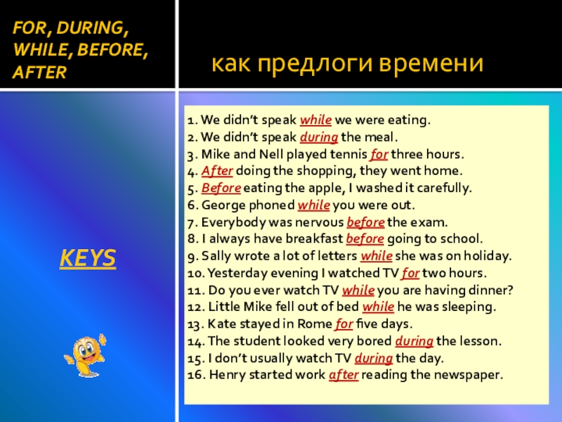 FOR, DURING, WHILE, BEFORE, AFTER