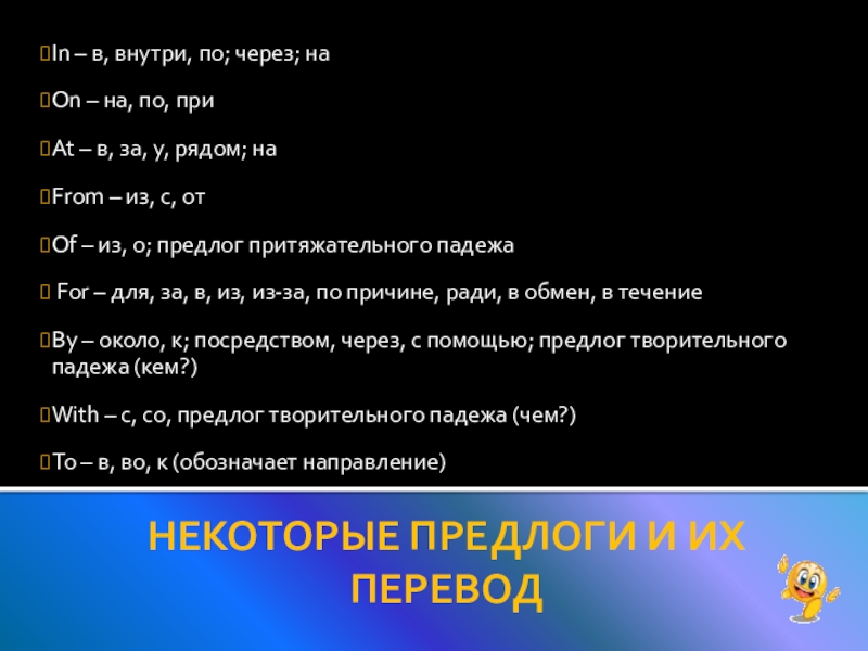 НЕКОТОРЫЕ ПРЕДЛОГИ И ИХ ПЕРЕВОД