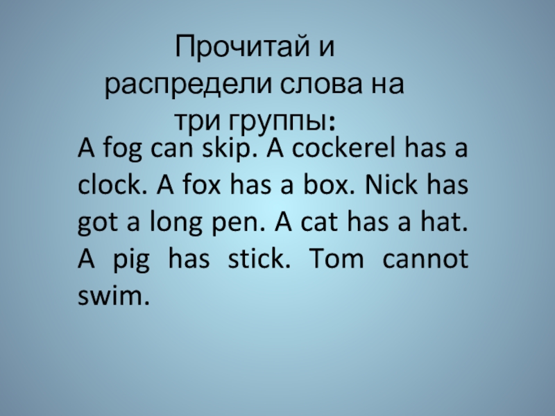 cockerel has a clock. A fox has a box. Nick has got a long pen. A cat has a hat. A pig has stick. Tom cannot swim.