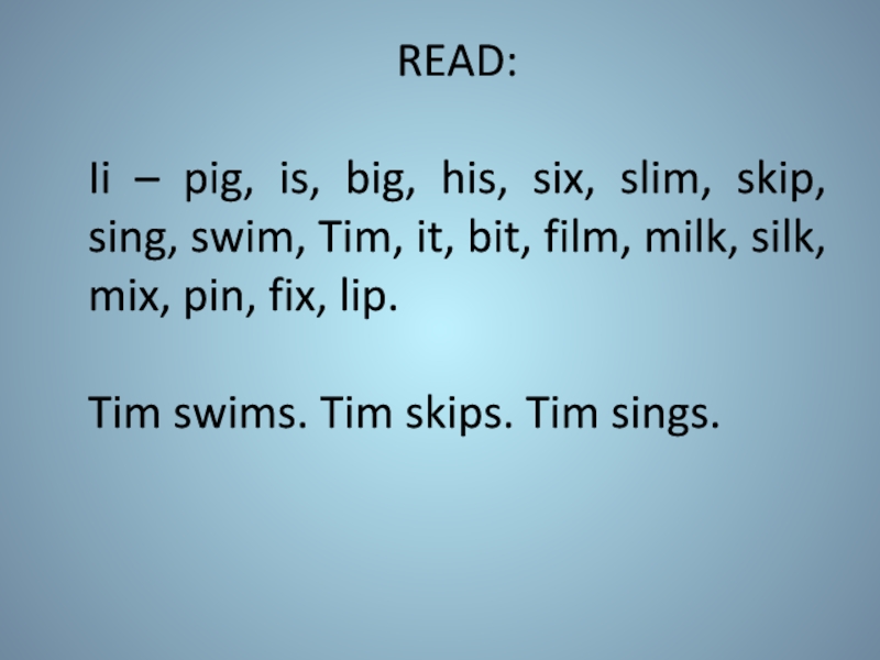 skip, sing, swim, Tim, it, bit, film, milk, silk, mix, pin, fix, lip.