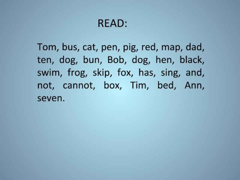 Bob, dog, hen, black, swim, frog, skip, fox, has, sing, and, not, cannot, box, Tim, bed, Ann, seven.
