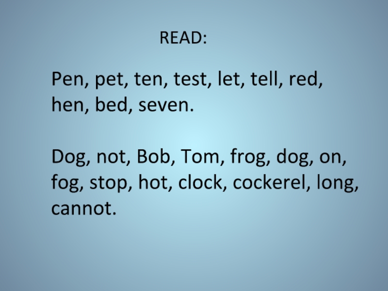 Слайд 11Pen, pet, ten, test, let, tell, red, hen, bed, seven.