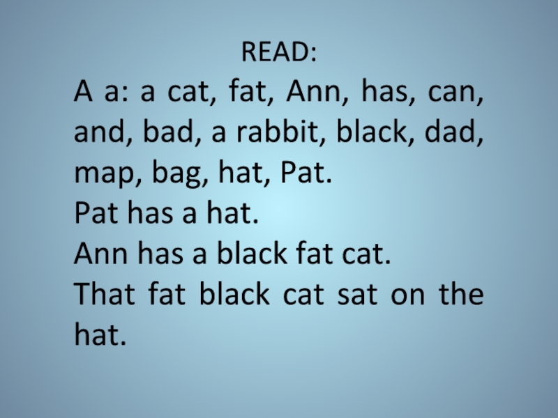 bad, a rabbit, black, dad, map, bag, hat, Pat.