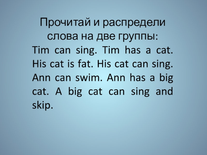 a cat. His cat is fat. His cat can sing. Ann can swim. Ann has a big cat. A big cat can sing and skip.
