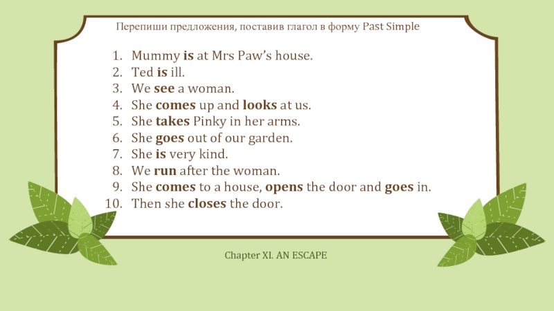Chapter XI. AN ESCAPEПерепиши предложения, поставив глагол в форму Past SimpleMummy is at Mrs Paw’s house.Ted is
