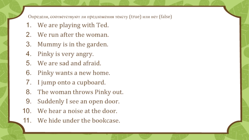 Слайд 4Определи, соответствуют ли предложения тексту (true) или нет (false)