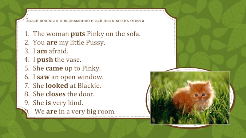 Задай вопрос к предложению и дай два кратких ответаThe woman puts Pinky on the sofa.You are my