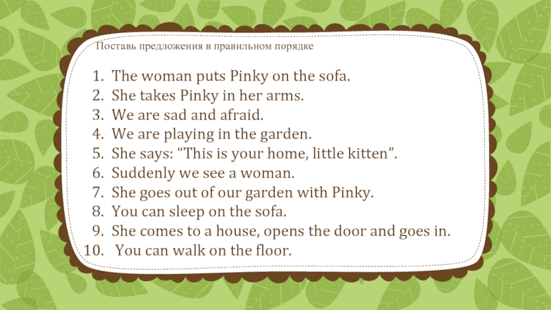 Поставь предложения в правильном порядкеThe woman puts Pinky on the sofa.She takes Pinky in her arms.We are