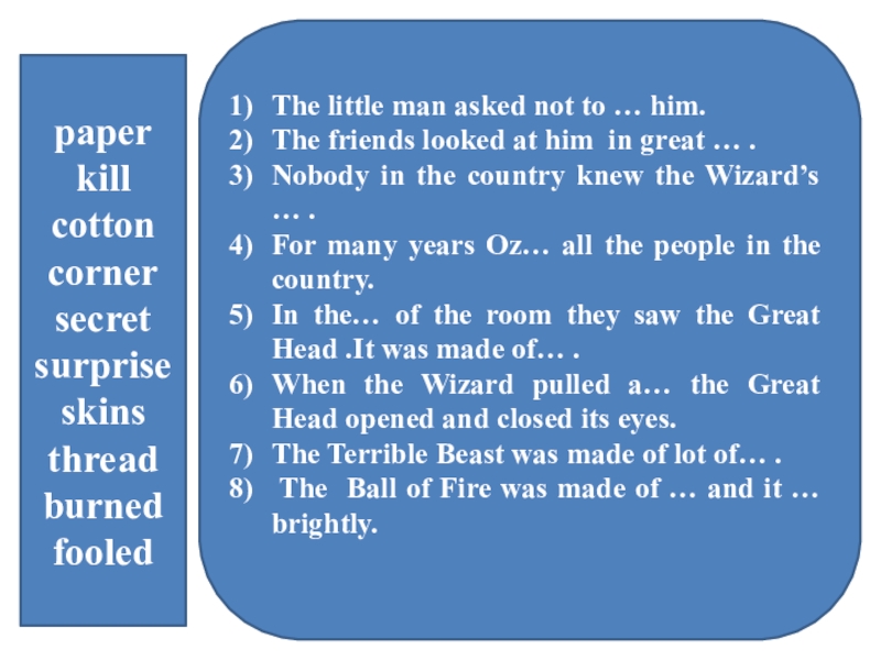 paperkillcottoncornersecretsurpriseskinsthreadburnedfooledThe little man asked not to … him.The friends looked at him in great … .Nobody in