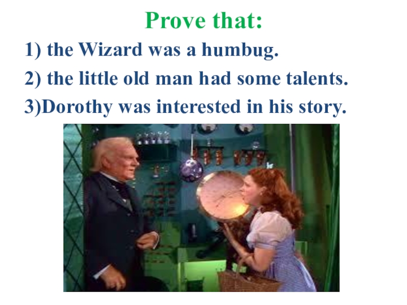 Prove that:1) the Wizard was a humbug.2) the little old man had some talents.3)Dorothy was interested in