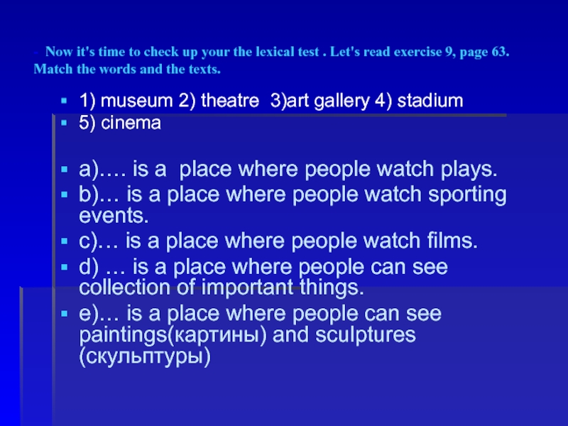 e)… is a place where people can see paintings(картины) and sculptures (скульптуры)