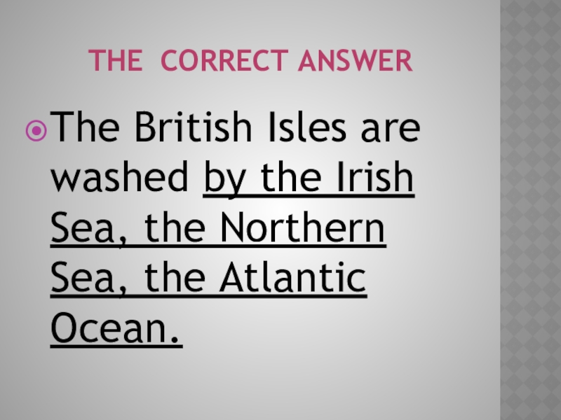 the correct answerThe British Isles are washed by the Irish Sea, the Northern Sea, the Atlantic Ocean.