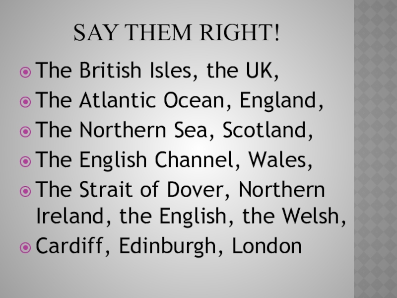 Say them right!The British Isles, the UK,The Atlantic Ocean, England,The Northern Sea, Scotland,The English Channel, Wales,The Strait of Dover, Northern Ireland, the English, the Welsh, Cardiff, Edinburgh, London