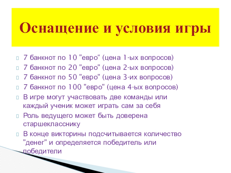 Оснащение и условия игры
