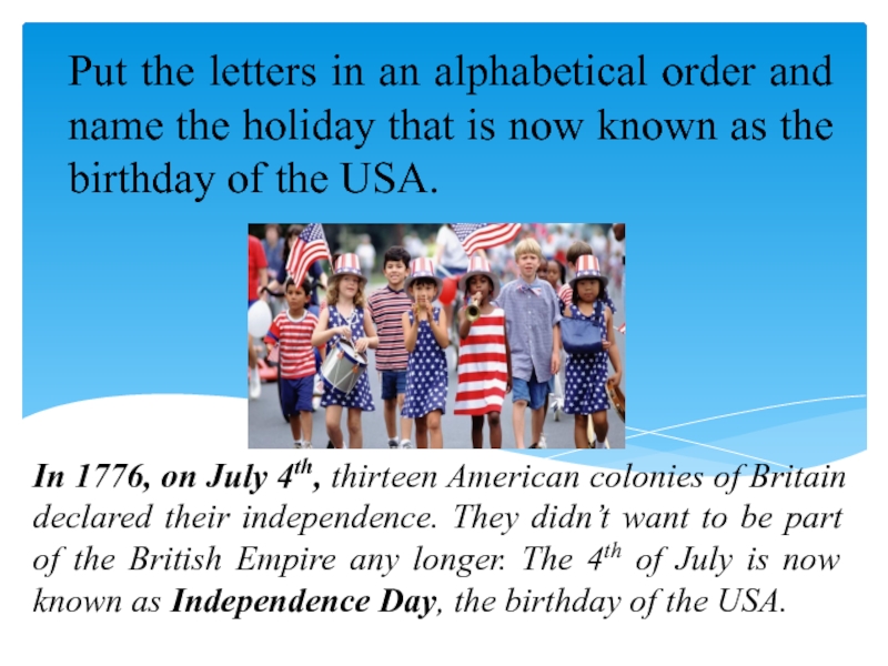 Put the letters in an alphabetical order and name the holiday that is now known as the birthday of the USA.