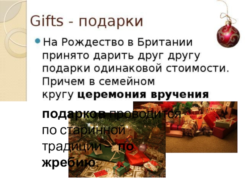 Слайд 7подарков проводится по старинной традиции – по жребию.