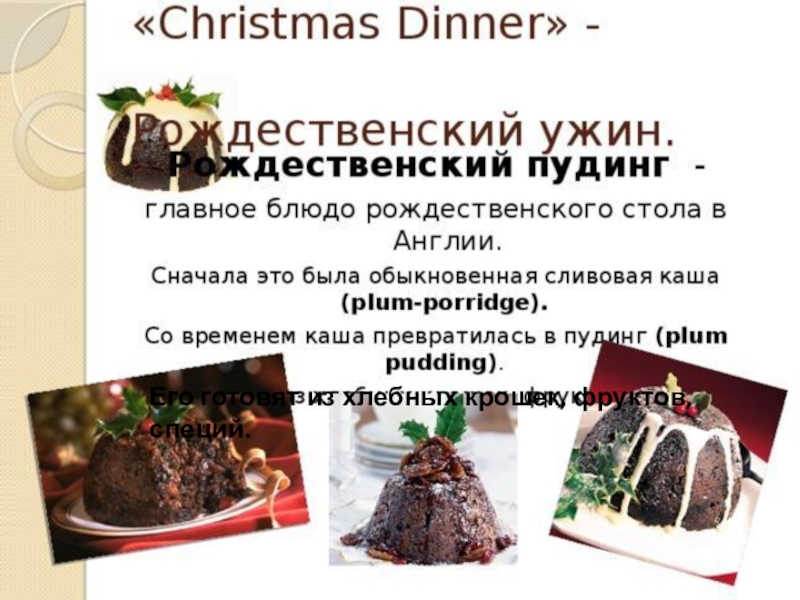 Слайд 5Его готовят из хлебных крошек, фруктов, специй.