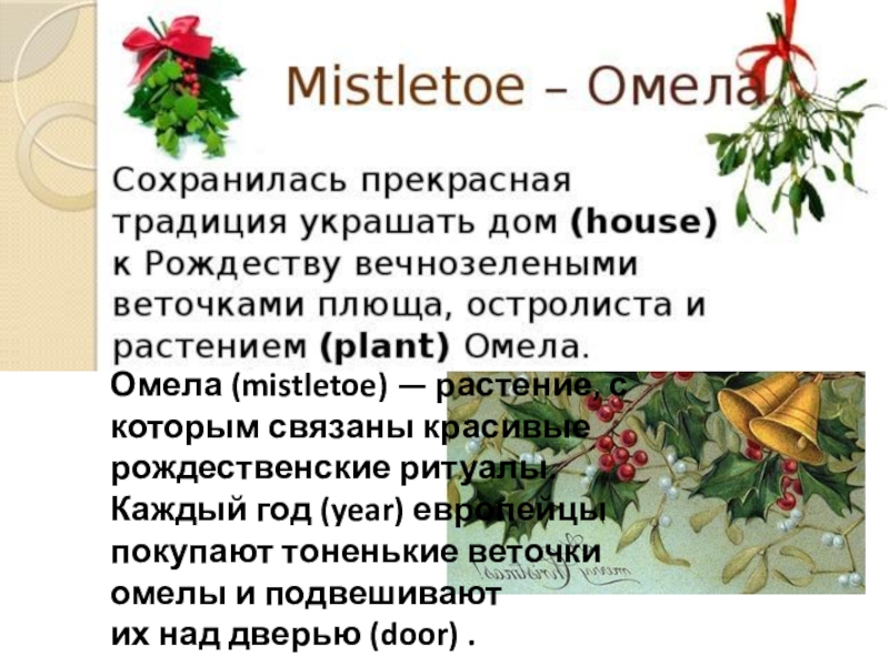 Омела (mistletoe) — растение, с которым связаны красивые рождественские ритуалы.Каждый год (year) европейцыпокупают тоненькие веточкиомелы и подвешиваютих