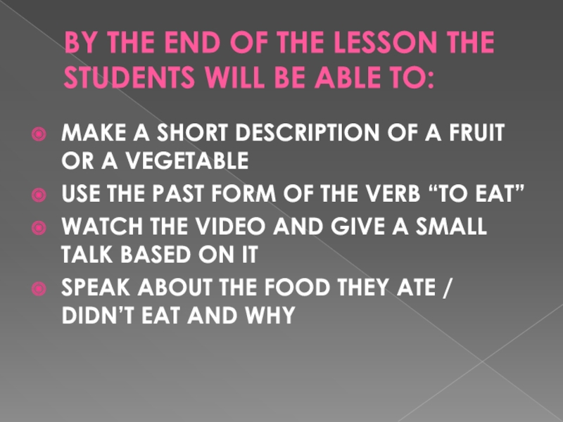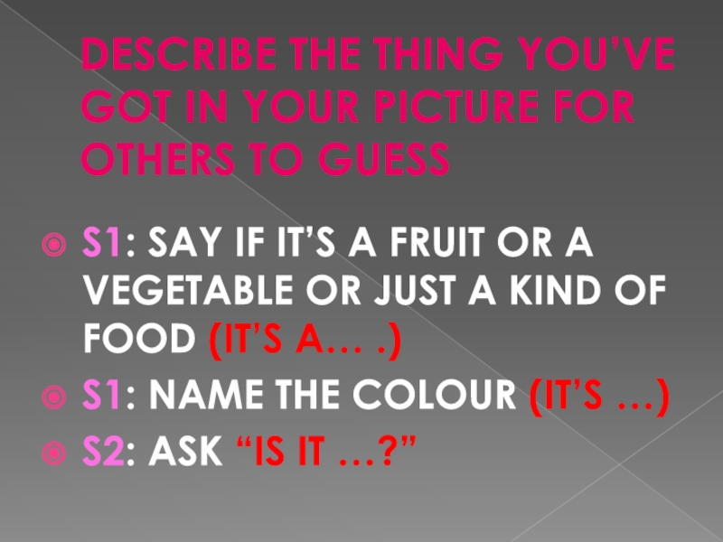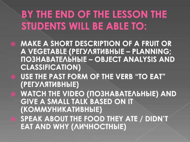 MAKE A SHORT DESCRIPTION OF A FRUIT OR A VEGETABLE (РЕГУЛЯТИВНЫЕ – PLANNING; ПОЗНАВАТЕЛЬНЫЕ – OBJECT ANALYSIS AND CLASSIFICATION)