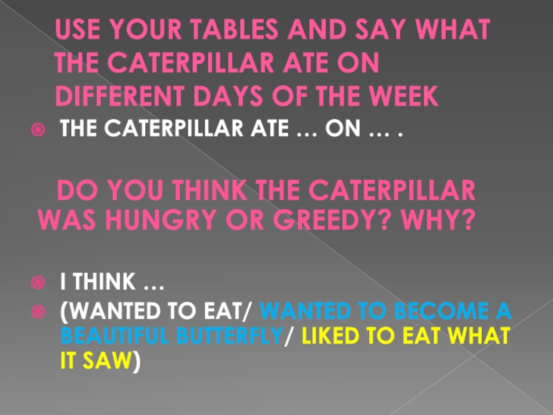 (WANTED TO EAT/ WANTED TO BECOME A BEAUTIFUL BUTTERFLY/ LIKED TO EAT WHAT IT SAW)