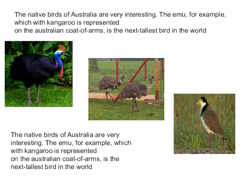 The native birds of Australia are very interesting. The emu, for example, which with kangaroo is represented