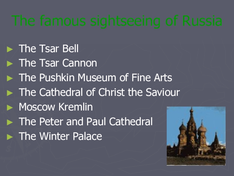 The famous sightseeing of RussiaThe Tsar BellThe Tsar CannonThe Pushkin Museum of Fine ArtsThe Cathedral of Christ