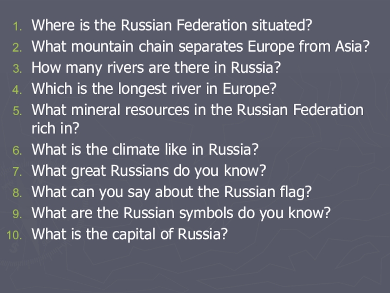 Where is the Russian Federation situated?What mountain chain separates Europe from Asia?How many rivers are there in