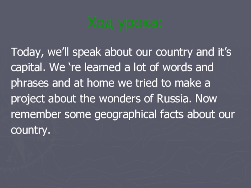 Ход урока:Today, we’ll speak about our country and it’s capital. We ‘re learned a lot of words
